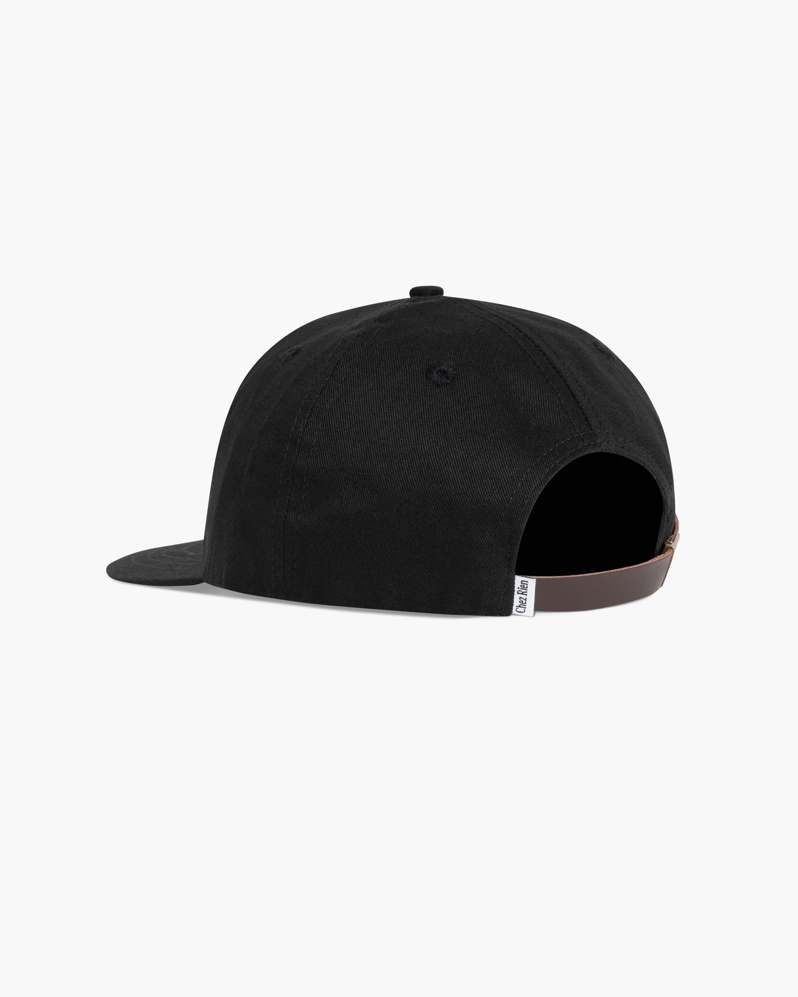Our Chainstitch Script Cap in Black. 6-panel cotton twill cap with our script logo chainstitch embroidery on the front. Low and boxy profile inspired by vintage baseball caps.