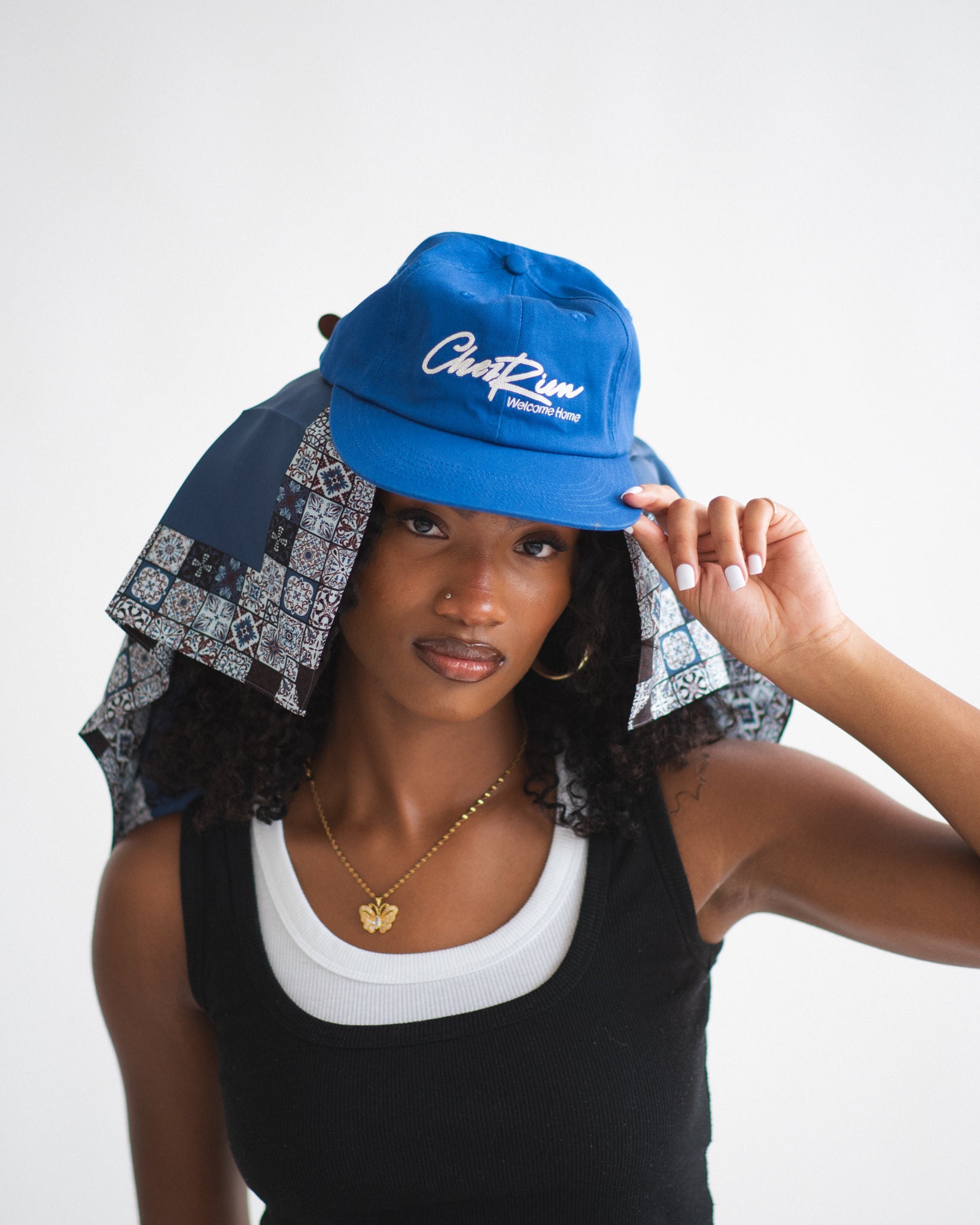 Our Chainstitch Script Cap in Cobalt. 6-panel cotton twill cap with our script logo chainstitch embroidery on the front. Low and boxy profile inspired by vintage baseball caps.