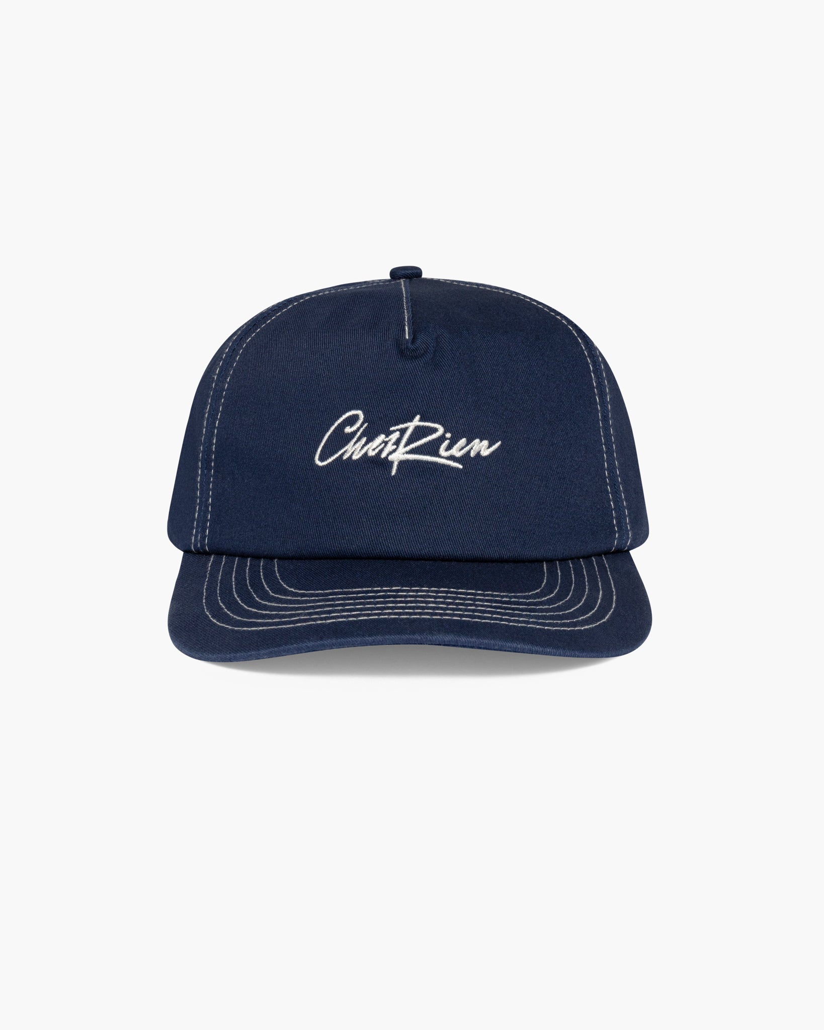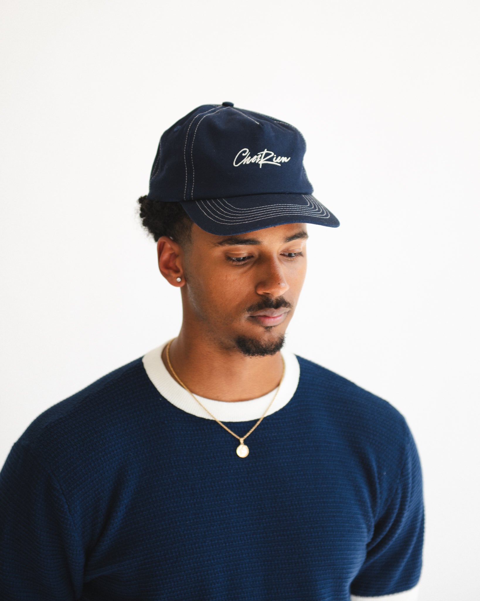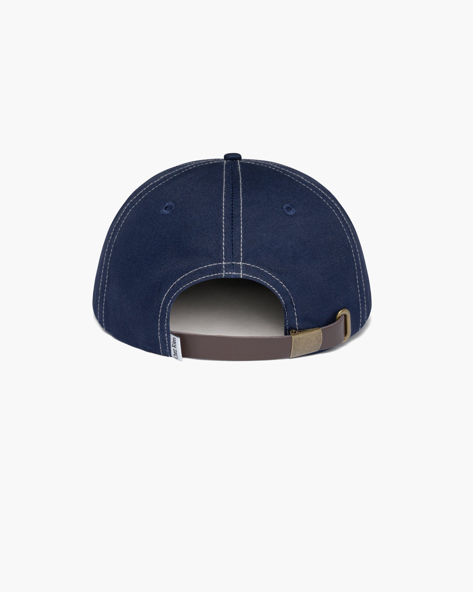 Our Contrast Stitch Script Cap in Navy. Unstructured 5-panel cotton twill cap, with contrast stitching throughout and our script logo embroidery on the front. Boxy profile inspired by vintage trucker caps.