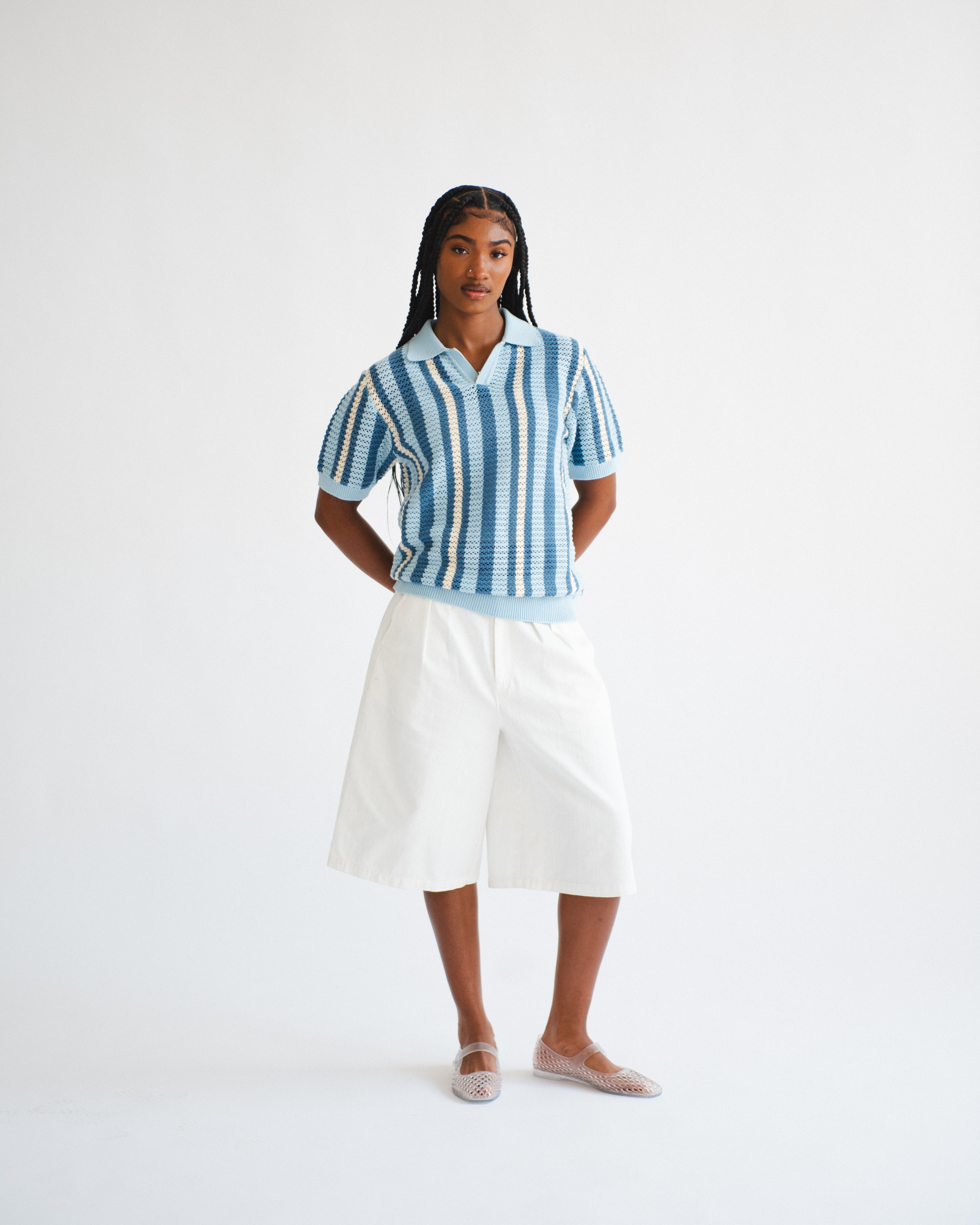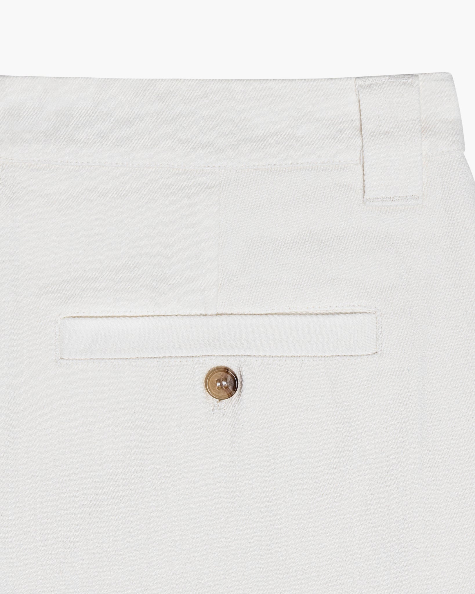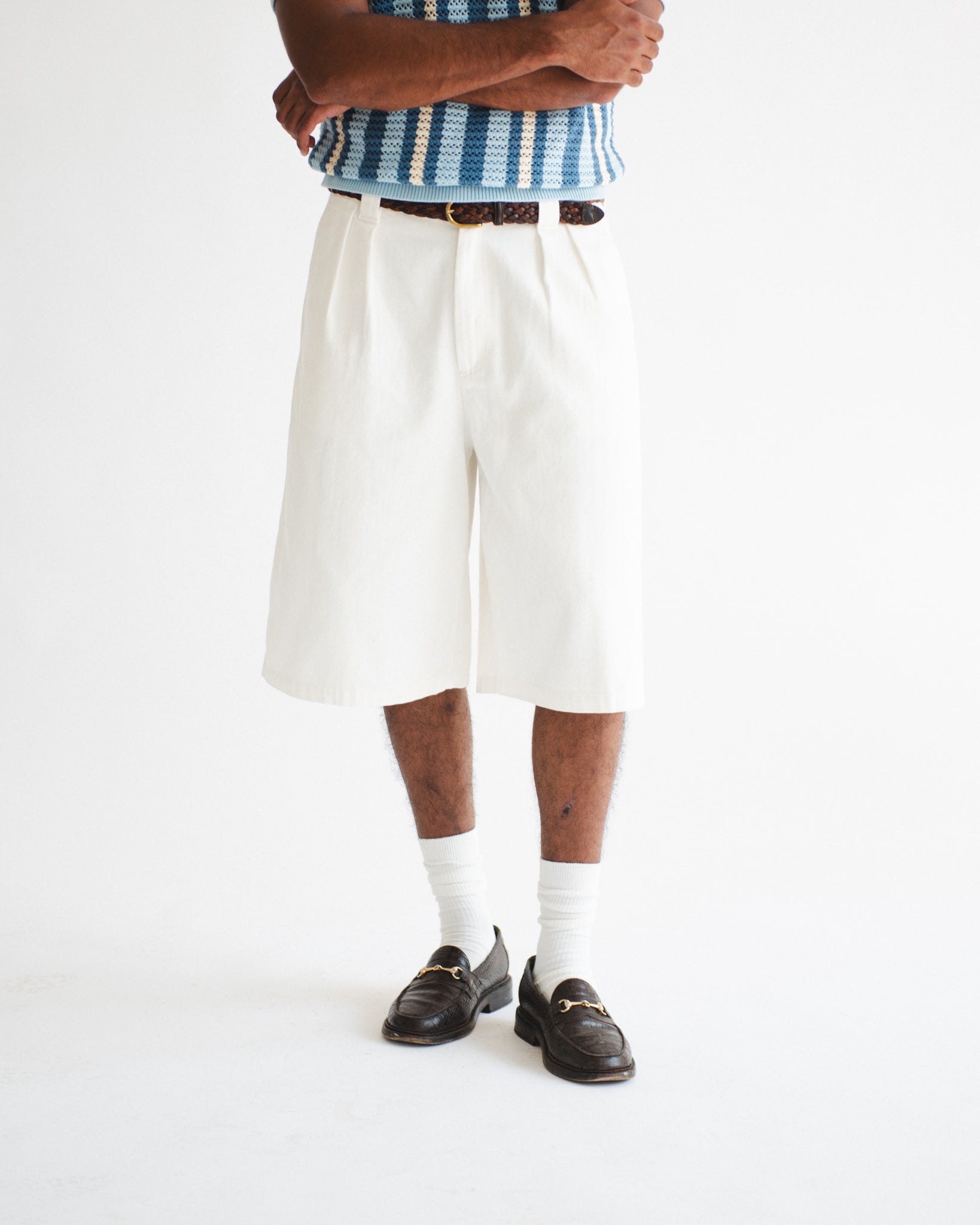 Our Giant Pleated Short in Bone. Mid-weight double-pleated shorts with a wide exaggerated fit for a tailored yet voluminous silhouette. Constructed from a 10oz cotton slub twill, with subtle vertical grain lines creating a distinct visual texture. Washed for a worn in look and feel.