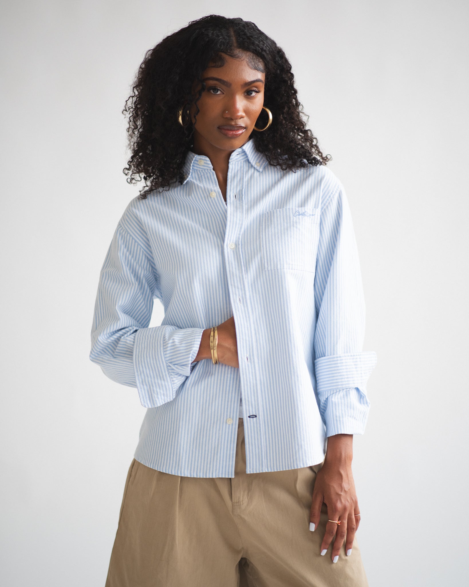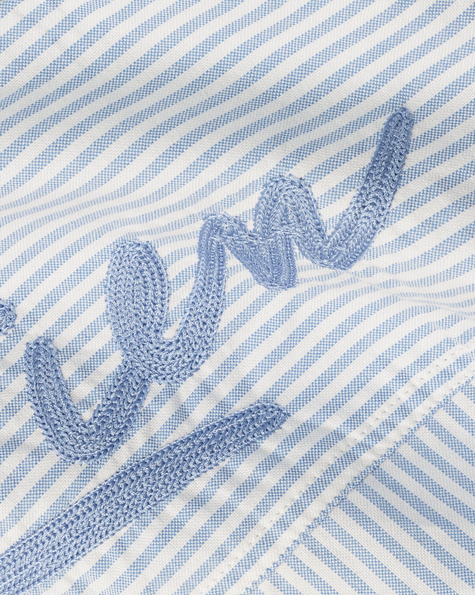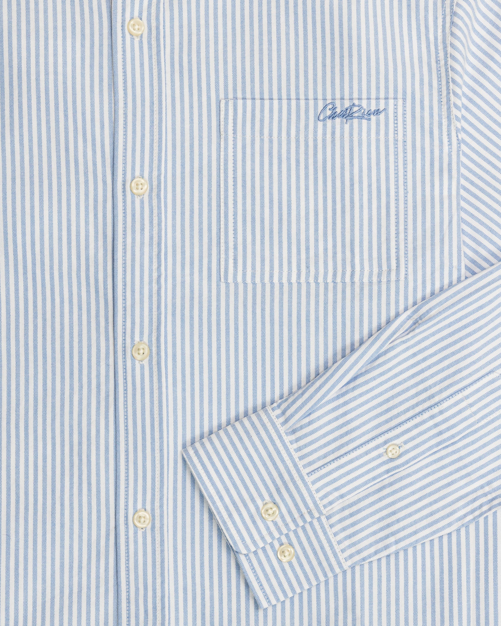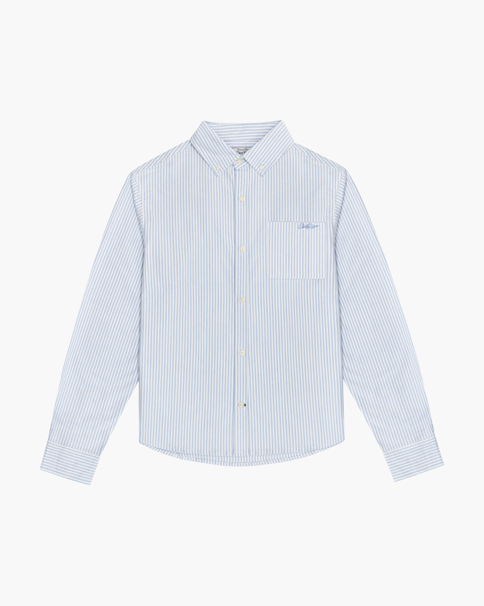 Our Chainstitch Oxford Shirt in Blue Stripe. Classic light blue striped oxford shirt, featuring our script logo in a tonal chainstitch embroidery on the back yoke. Constructed from a rugged midweight cotton fabric, with a boxy untucked fit.
