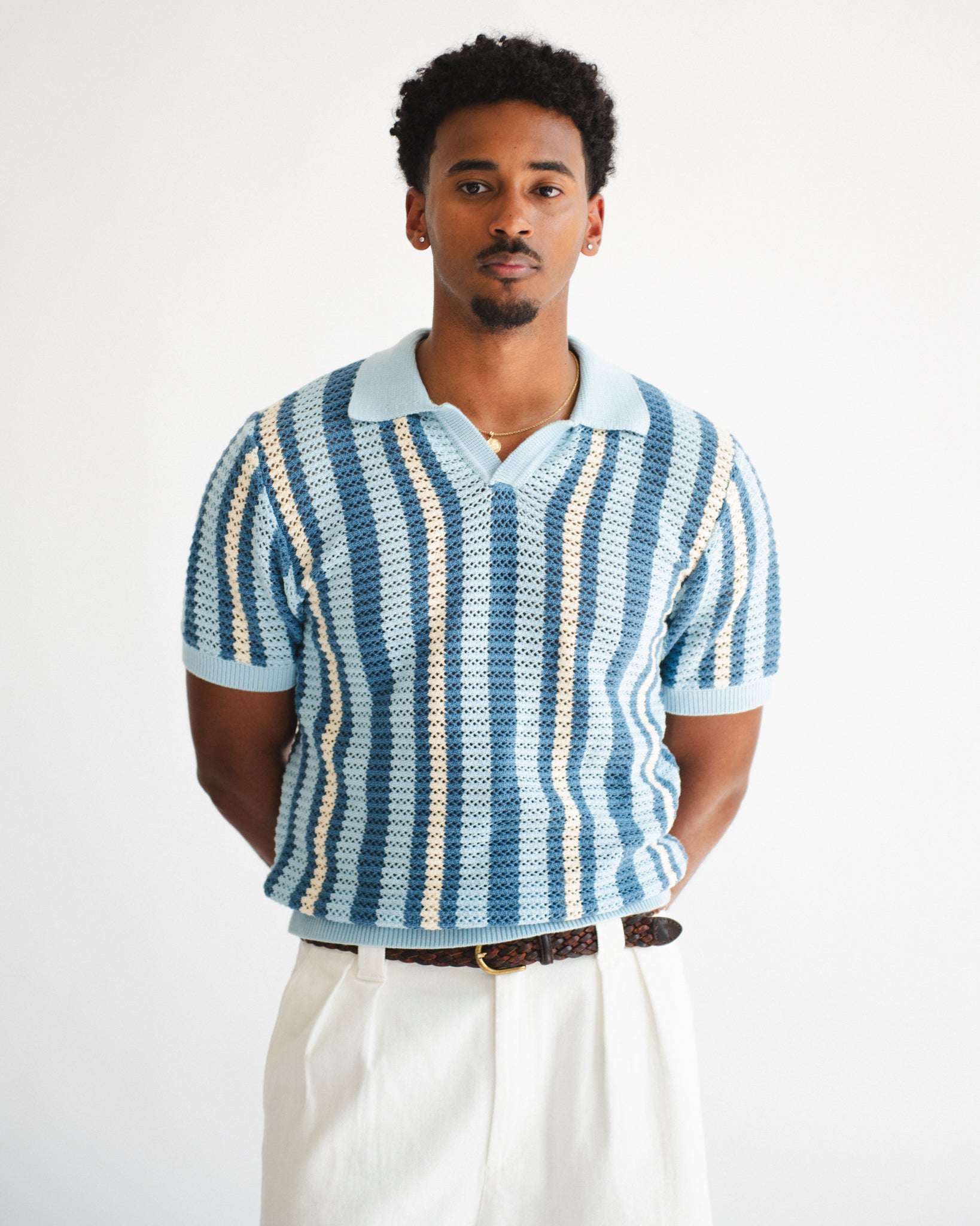 Our Crochet Johnny Collar Polo in Sky. Novelty textured polo knitted with 100% organic cotton, featuring a distinct open stitch structure for extra breathability. Classic fitted silhouette with an open johnny collar construction.