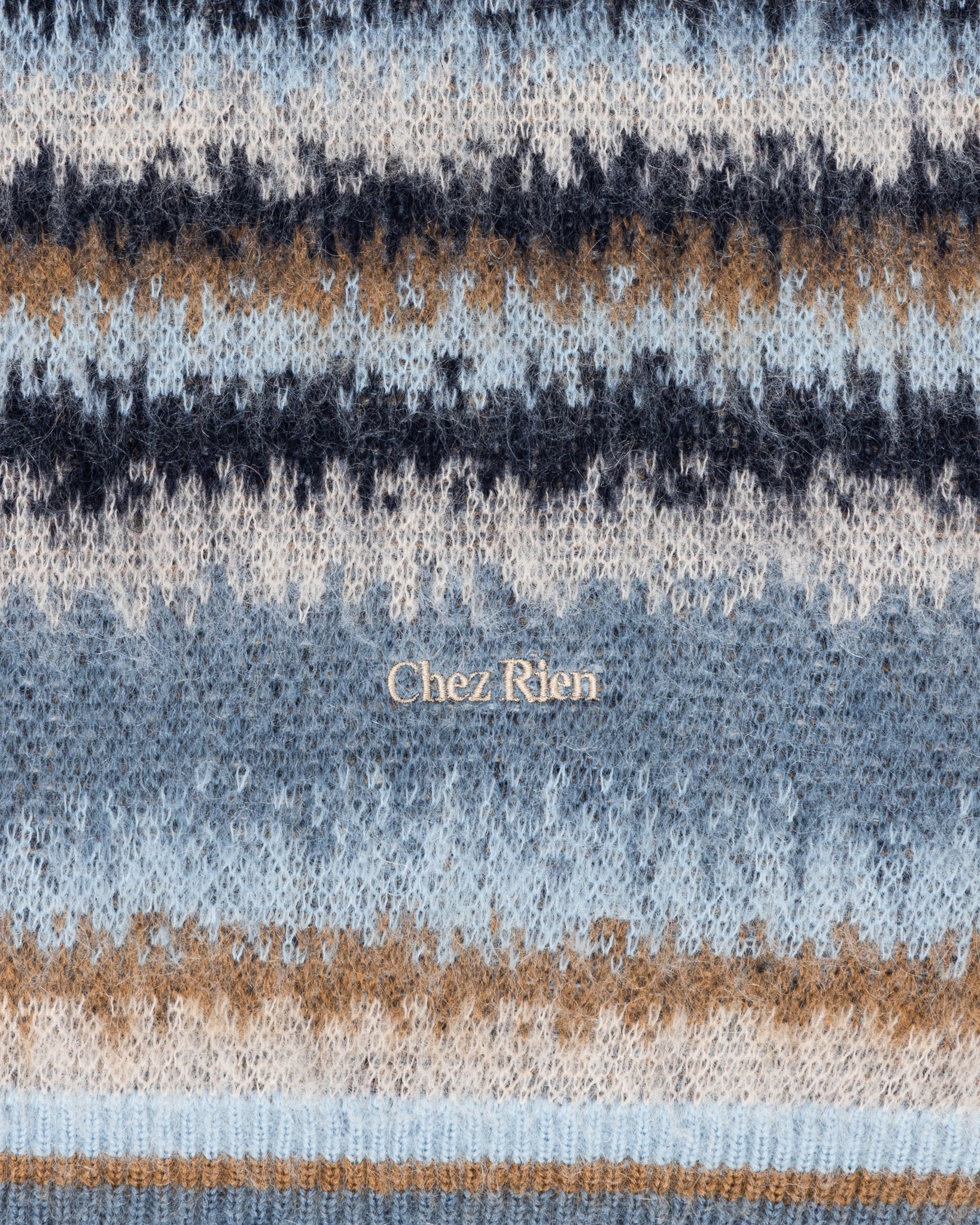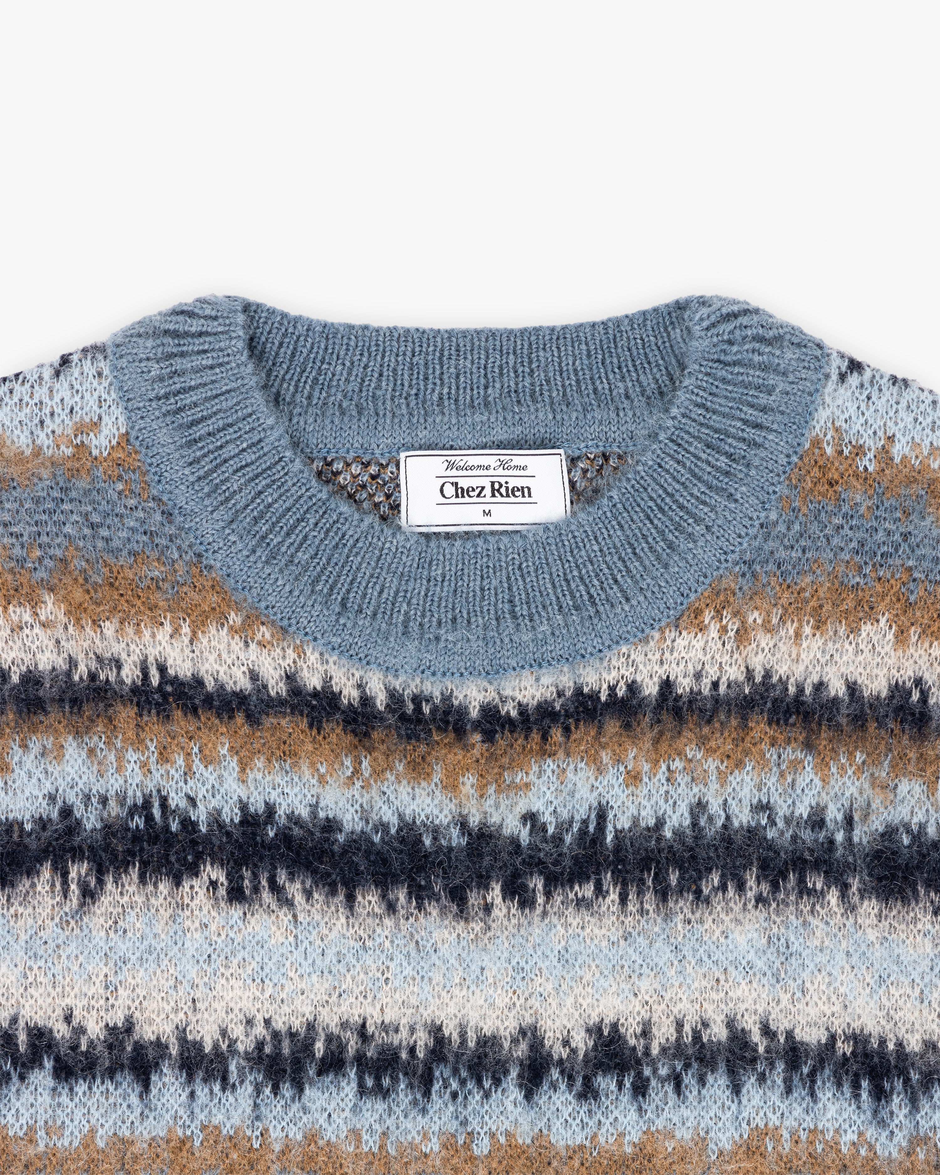 Our Gradient Stripe Sweater Vest in Sky. Jacquard striped vest knitted with a mid-weight mohair blend for breathability and comfort. Brushed for a soft, fuzzy finish.
