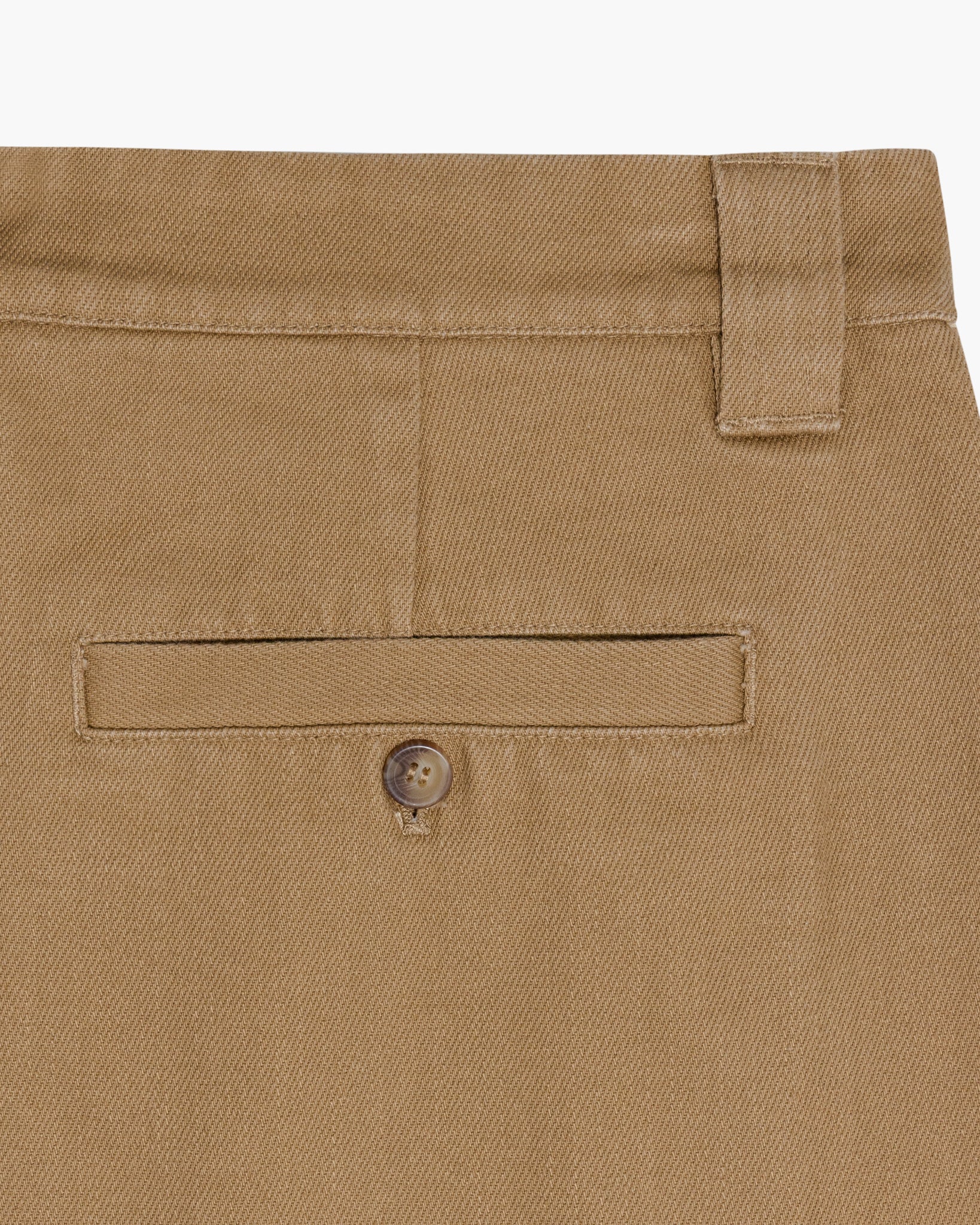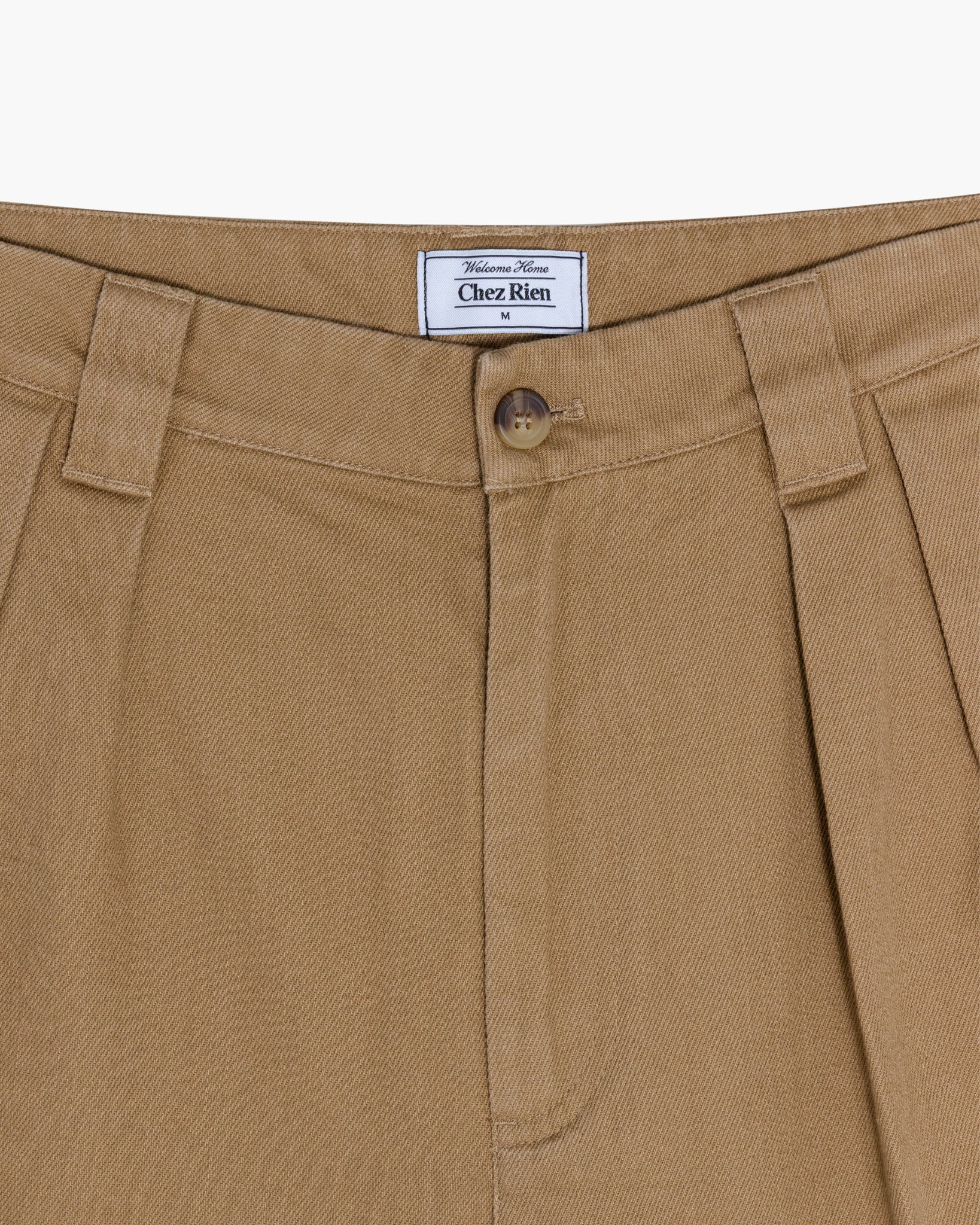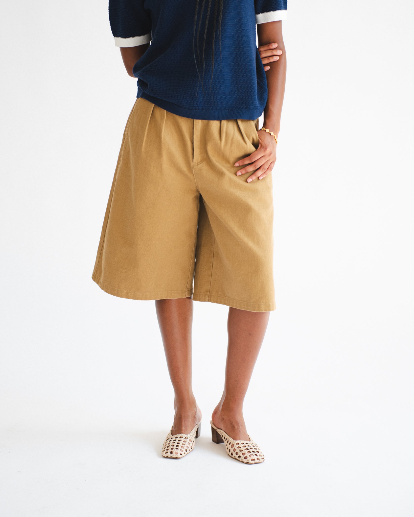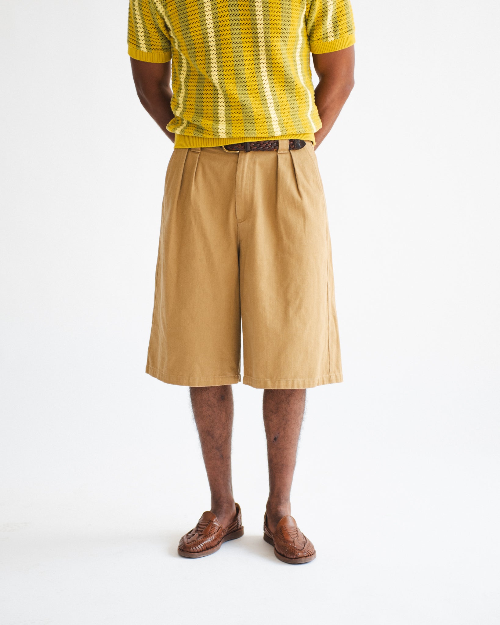 Our Giant Pleated Short in Hazelnut. Mid-weight double-pleated shorts with a wide exaggerated fit for a tailored yet voluminous silhouette. Constructed from a 10oz cotton slub twill, with subtle vertical grain lines creating a distinct visual texture. Washed for a worn in look and feel.