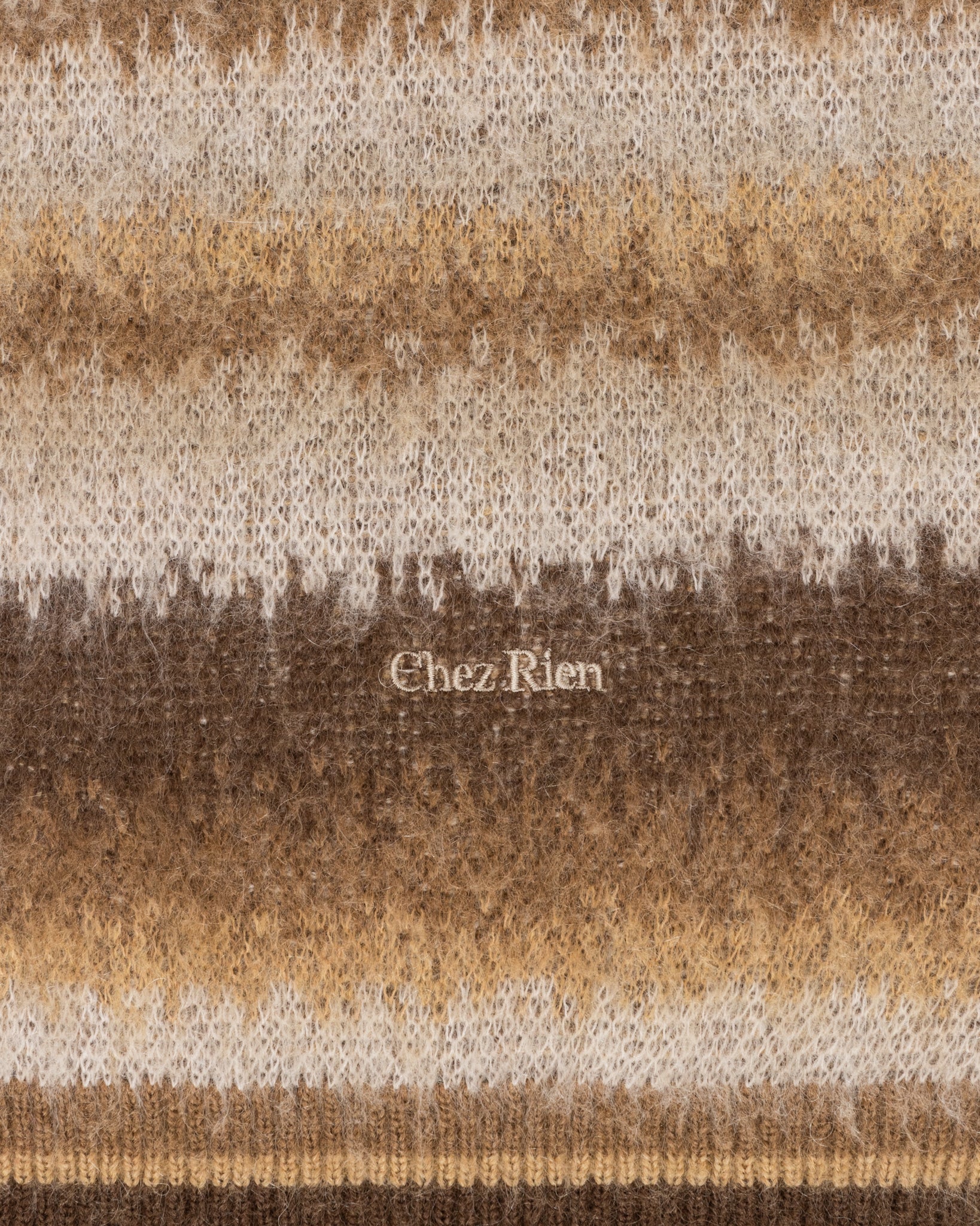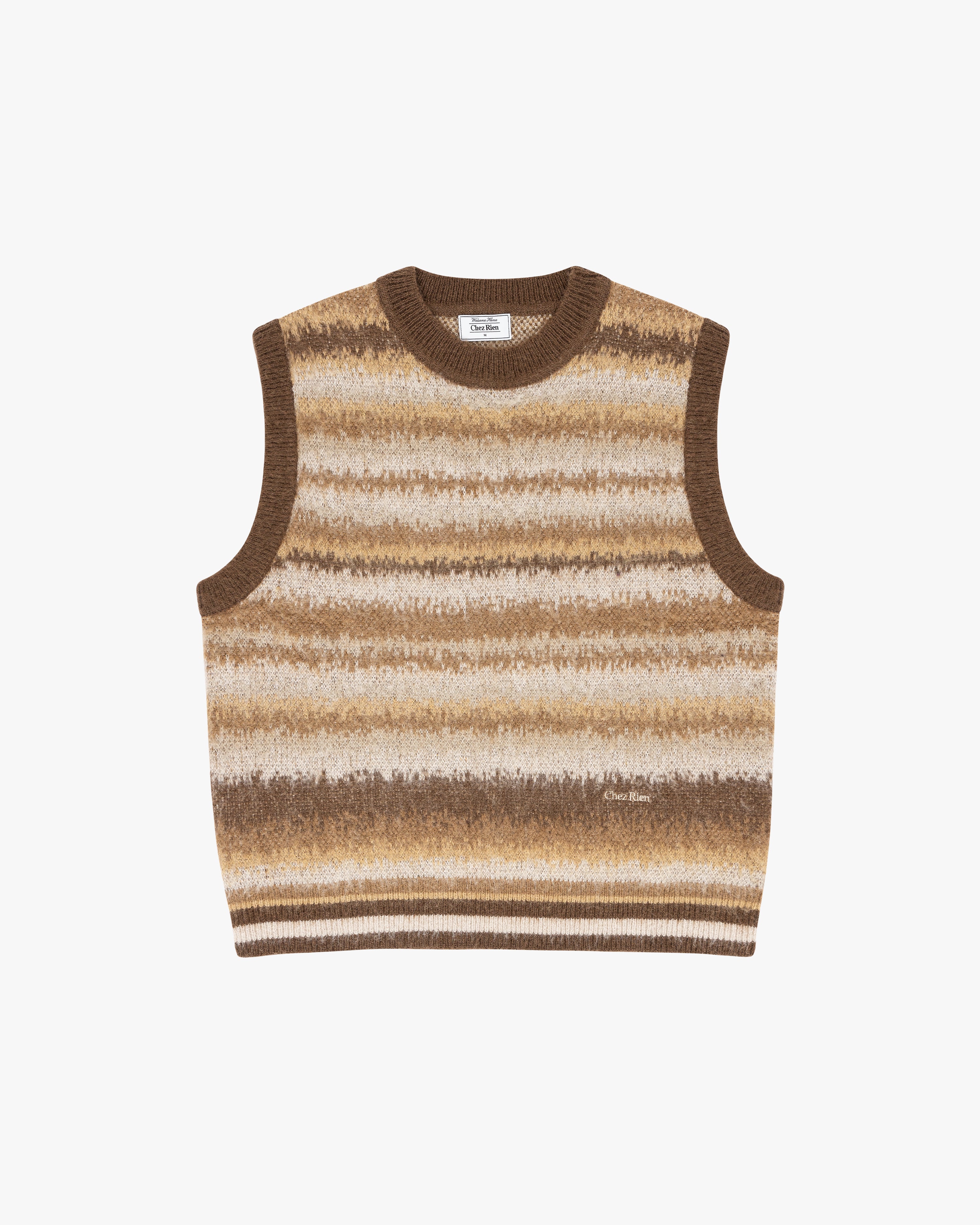 Our Gradient Stripe Sweater Vest in Dune. Jacquard striped vest knitted with a mid-weight mohair blend for breathability and comfort. Brushed for a soft, fuzzy finish.