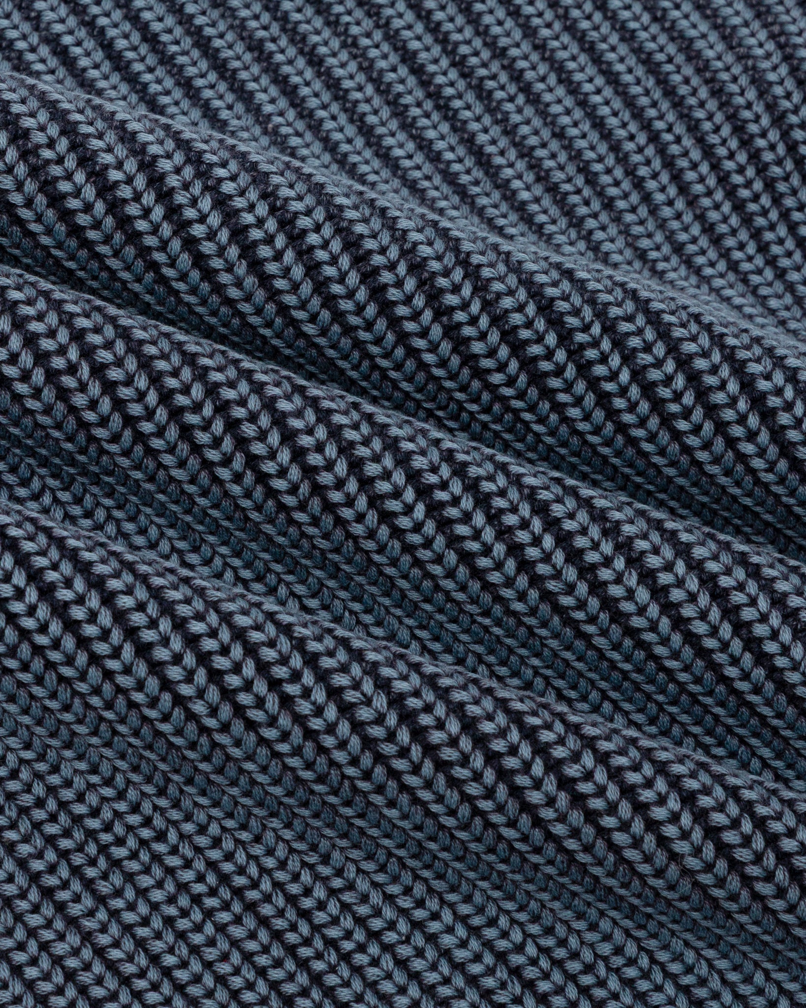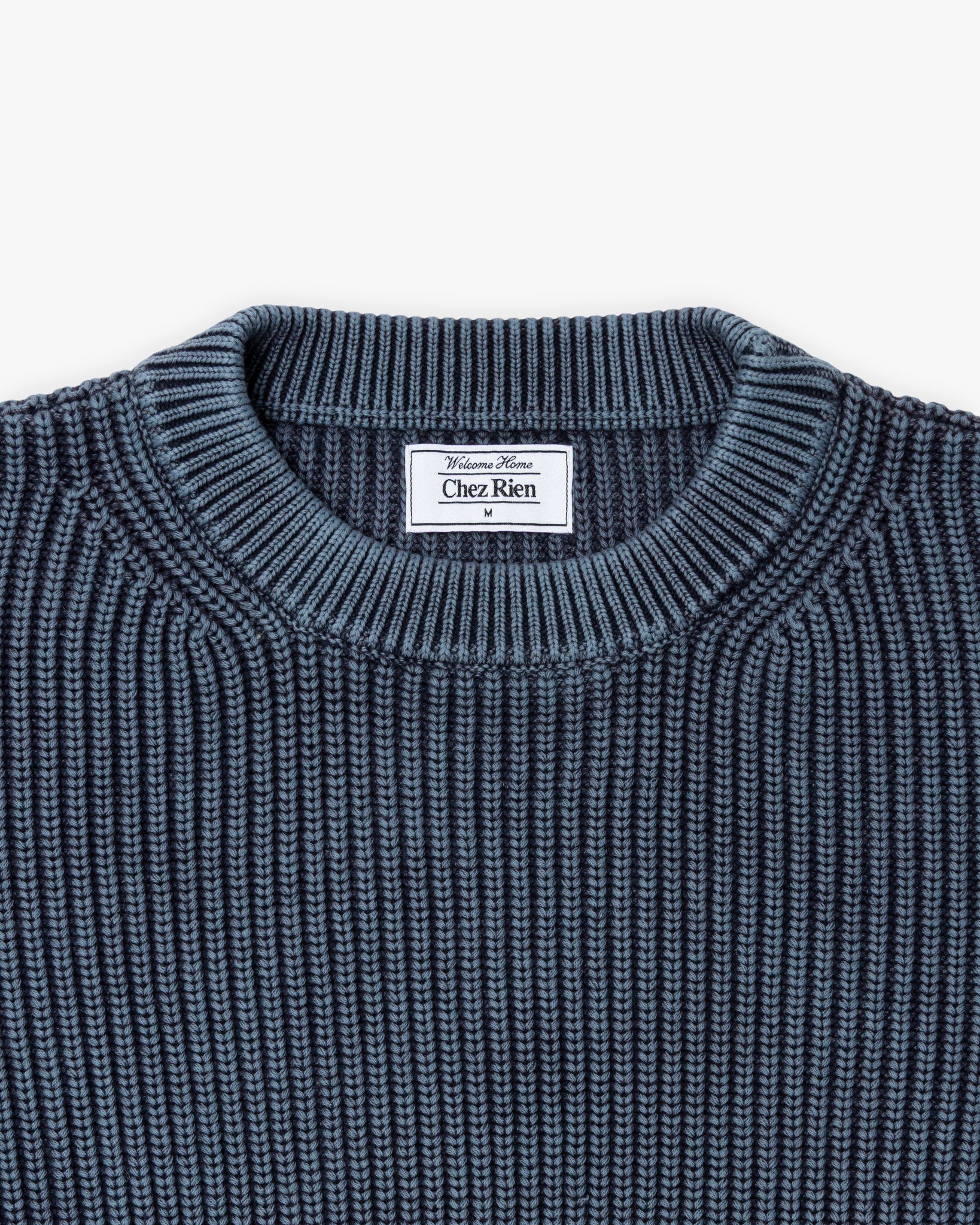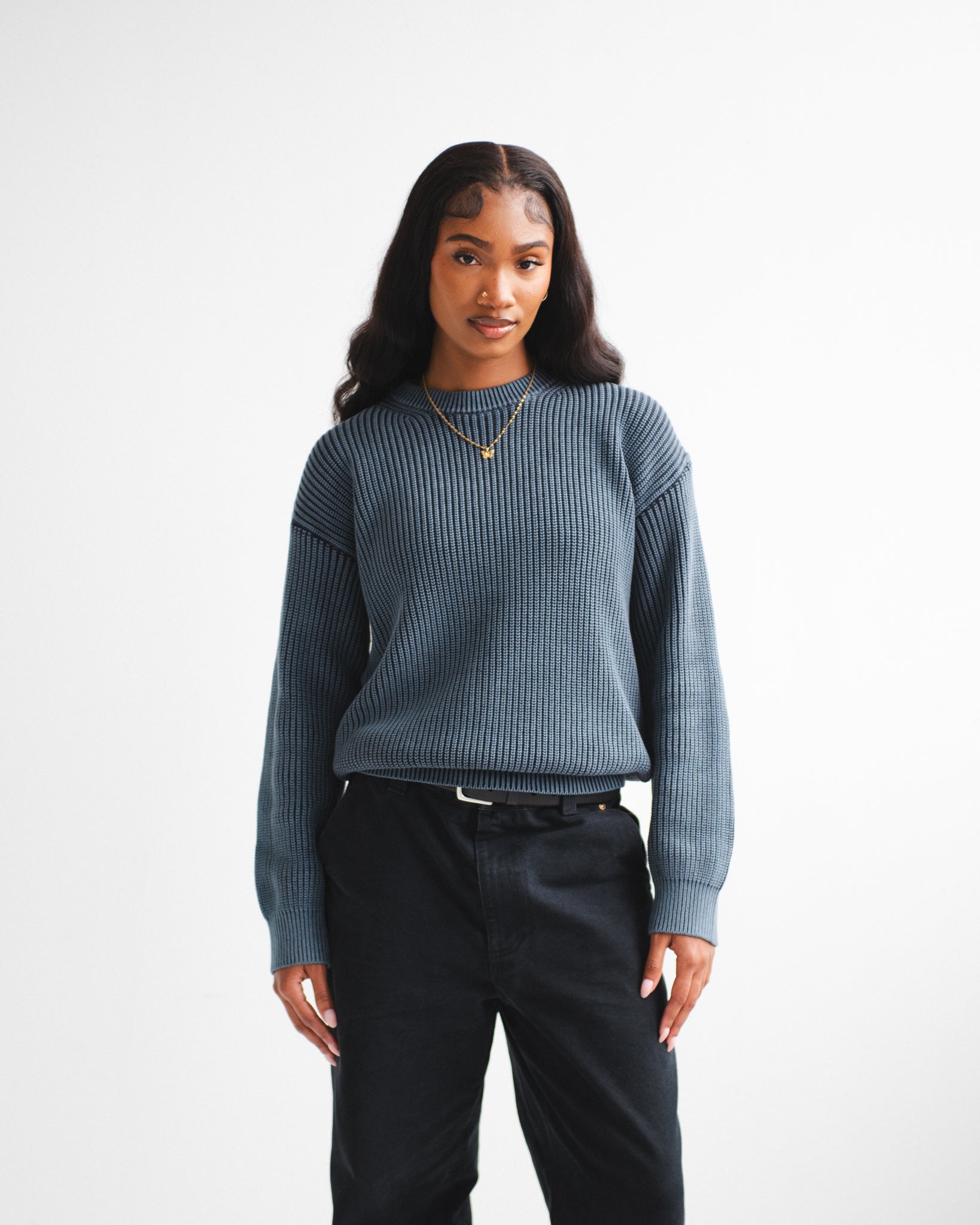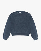 Our Heavy Shaker Sweater in Navy. Premium heavyweight crewneck sweater knitted with 100% organic cotton. Featuring a distinctive wash for a lived-in look and feel, and a boxy relaxed silhouette for effortless styling.