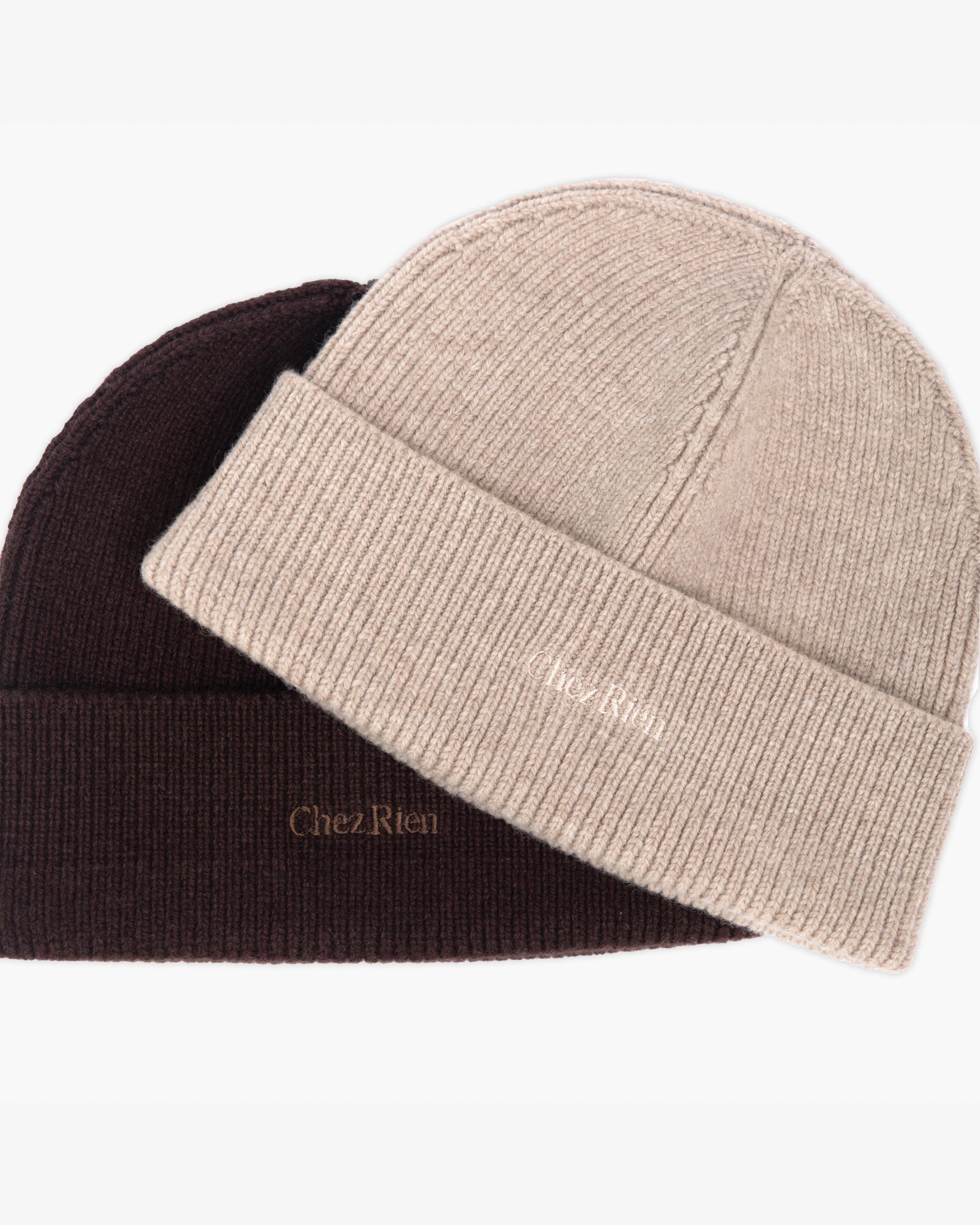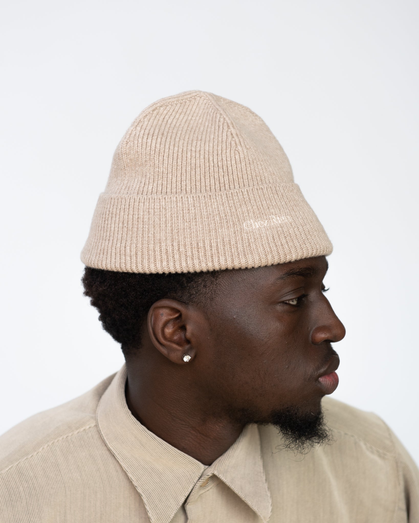 Our Merino Knit Beanie in Sand. High-density rib stitch beanies knitted with an Italian-spun extra fine Merino Wool blend. Full-fashioned construction for zero-waste.