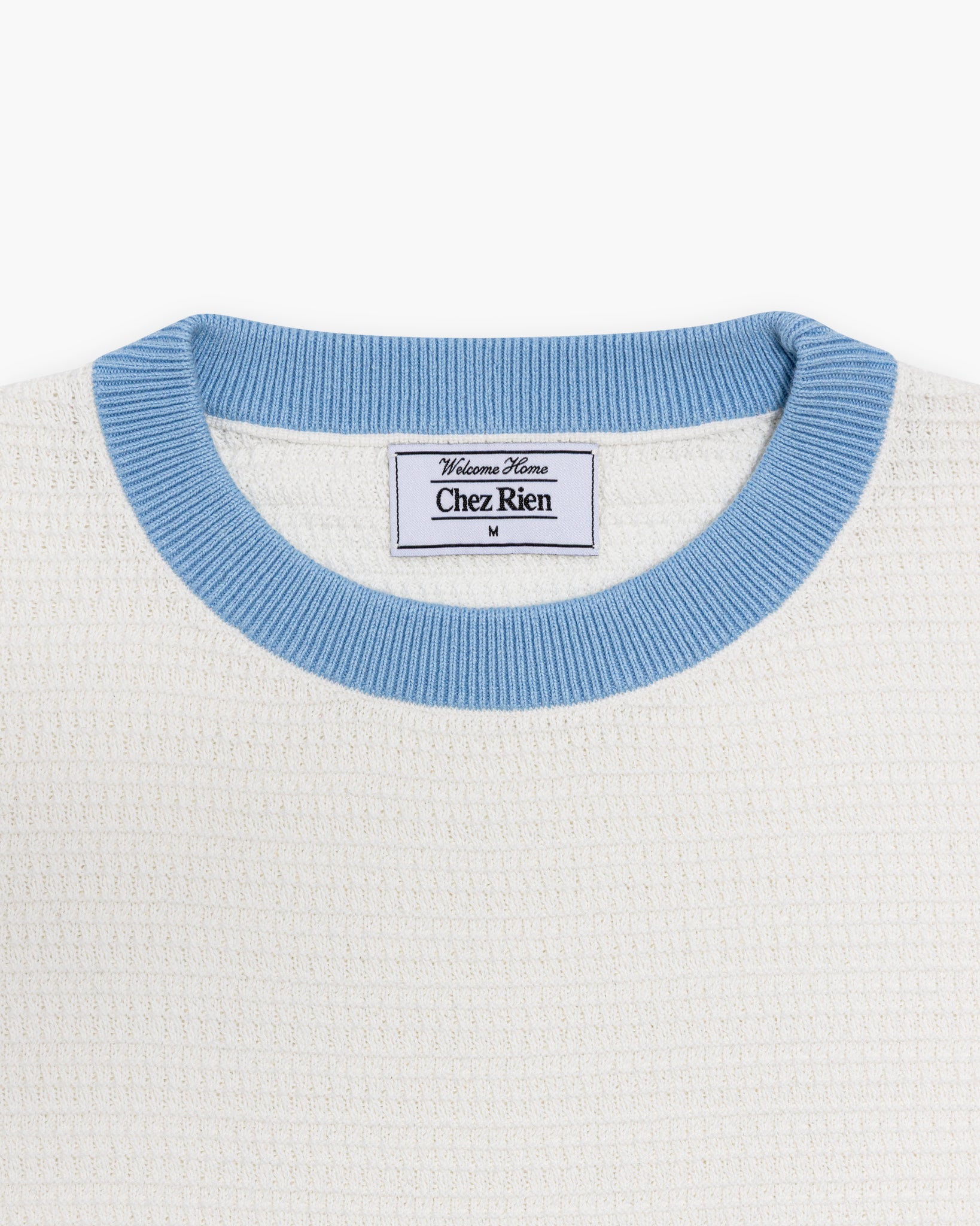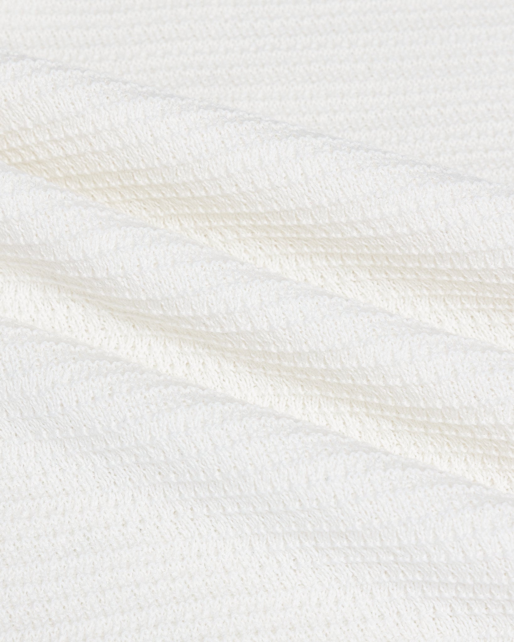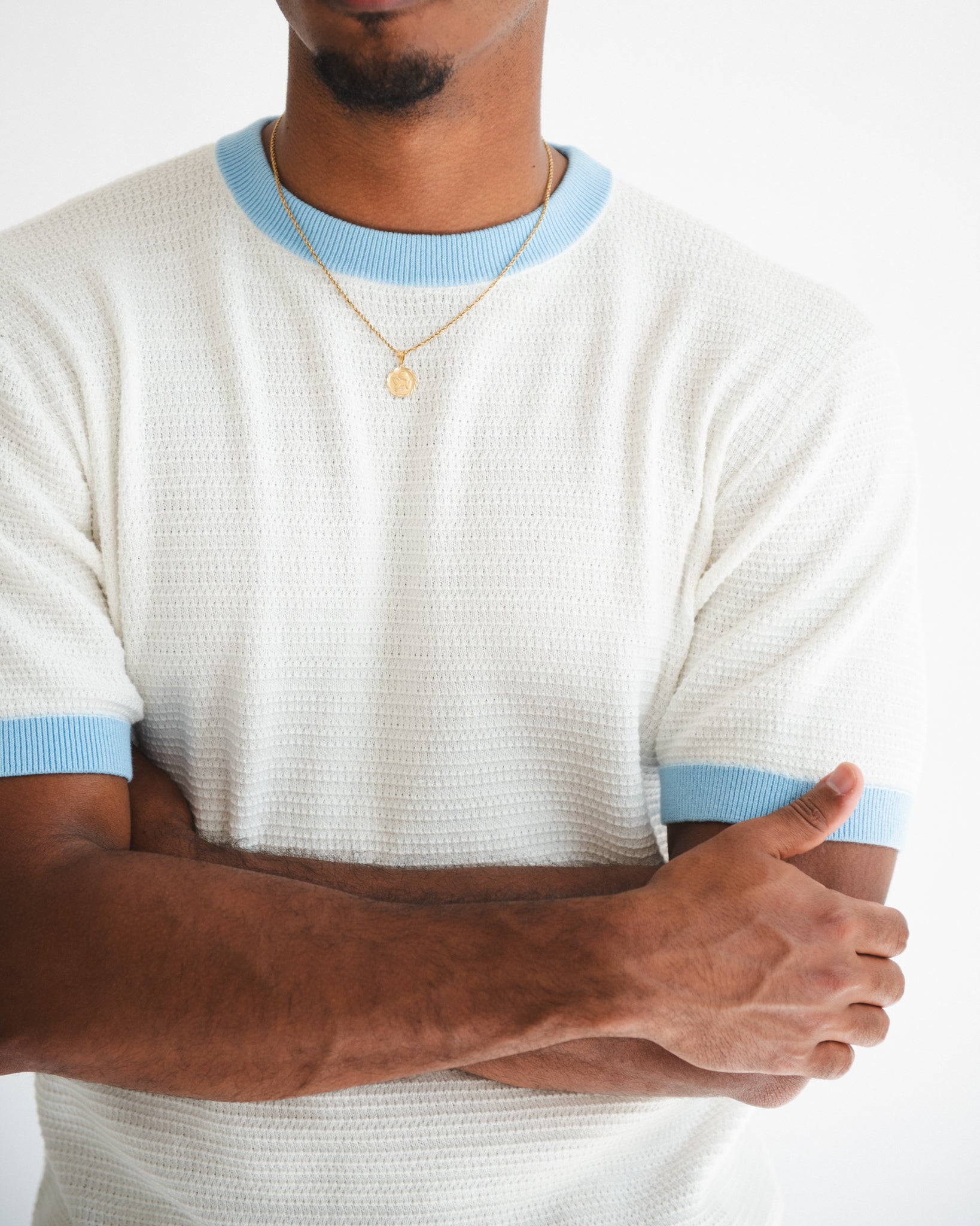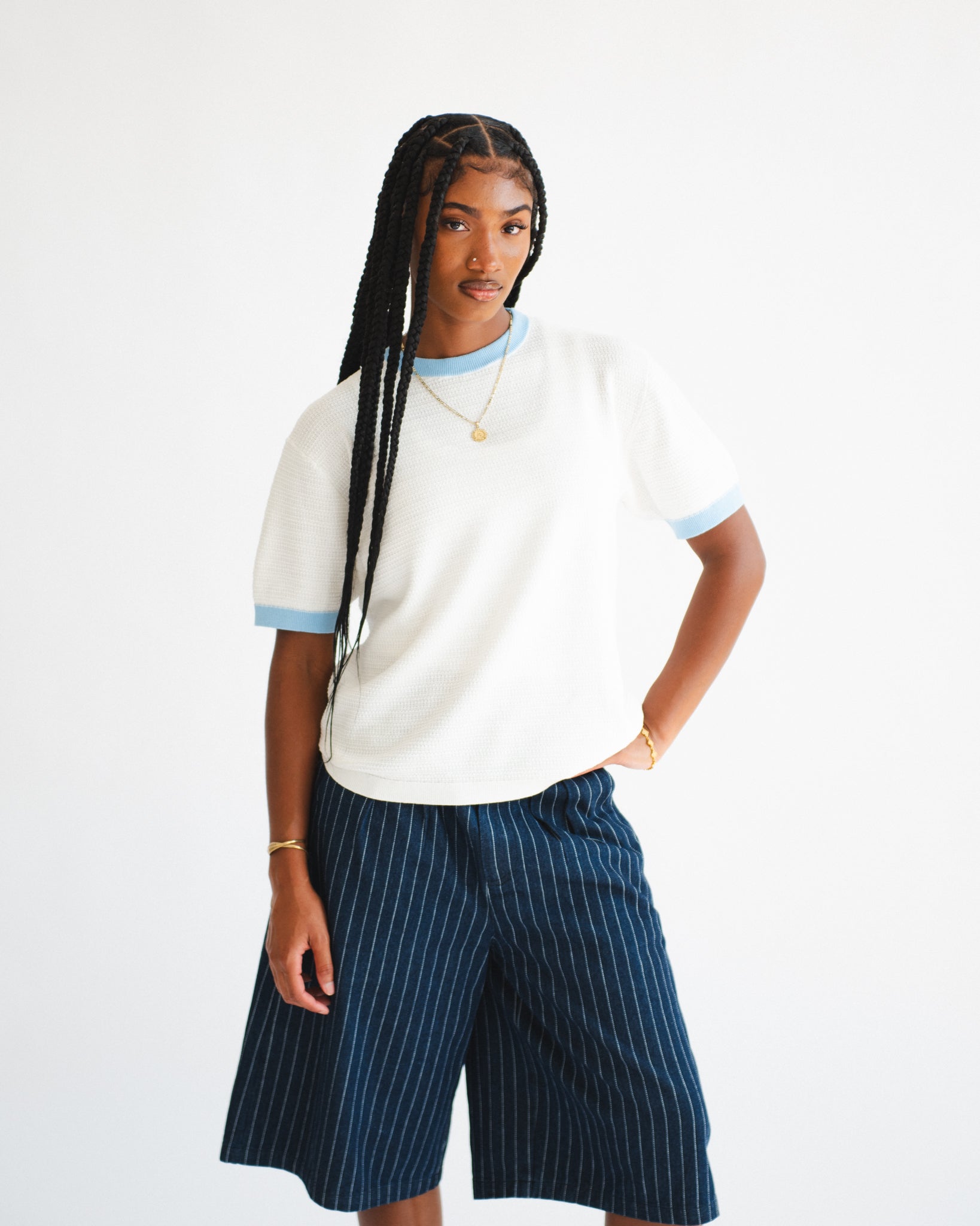Our Textured Knit Ringer Tee in Bone. Mid-weight 70s inspired ringer tees, elevated with a fully knitted body in a unique textured stitch. Crafted from our signature 100% organic cotton, they feature a classic fit with a semi-cropped length for effortless styling.