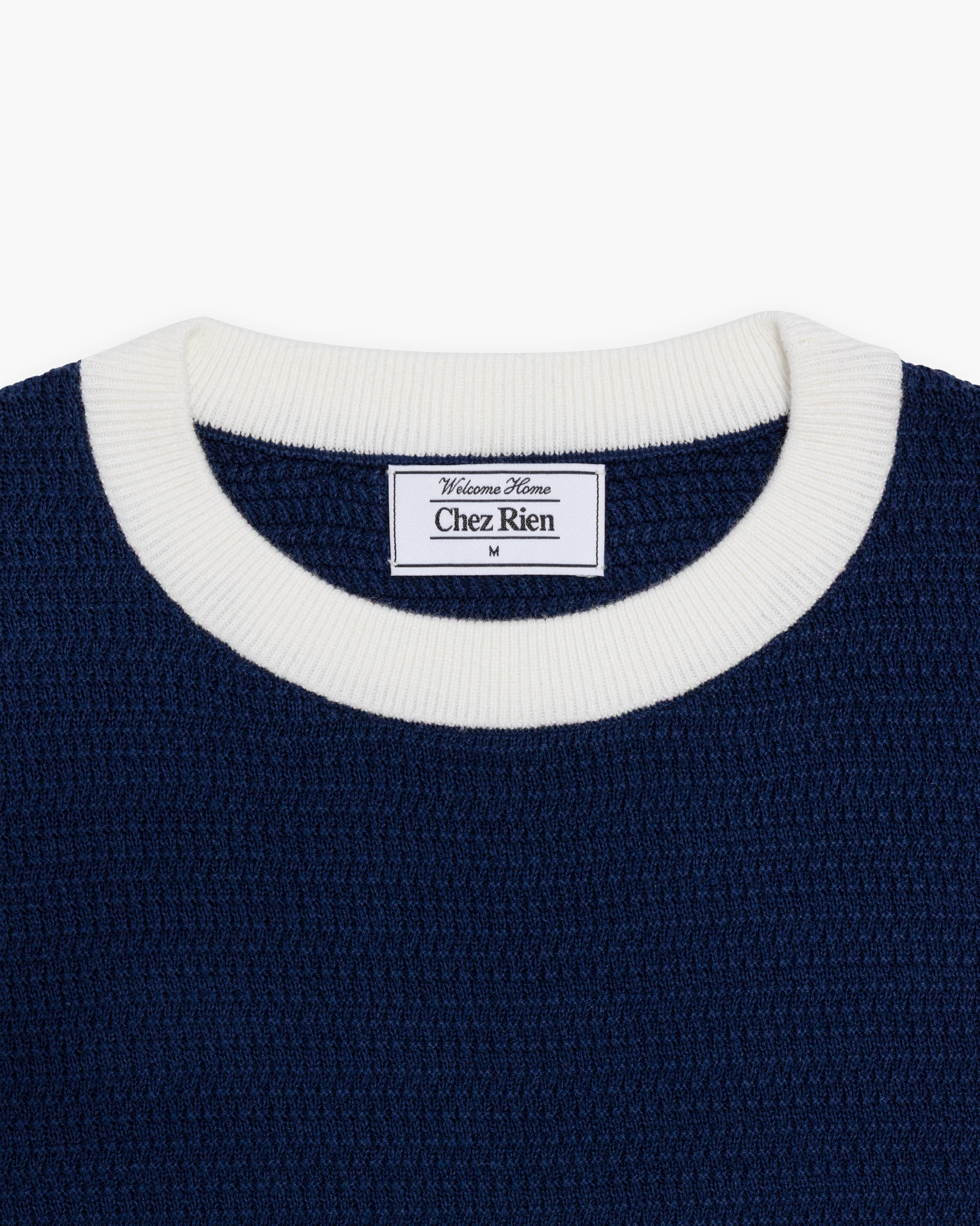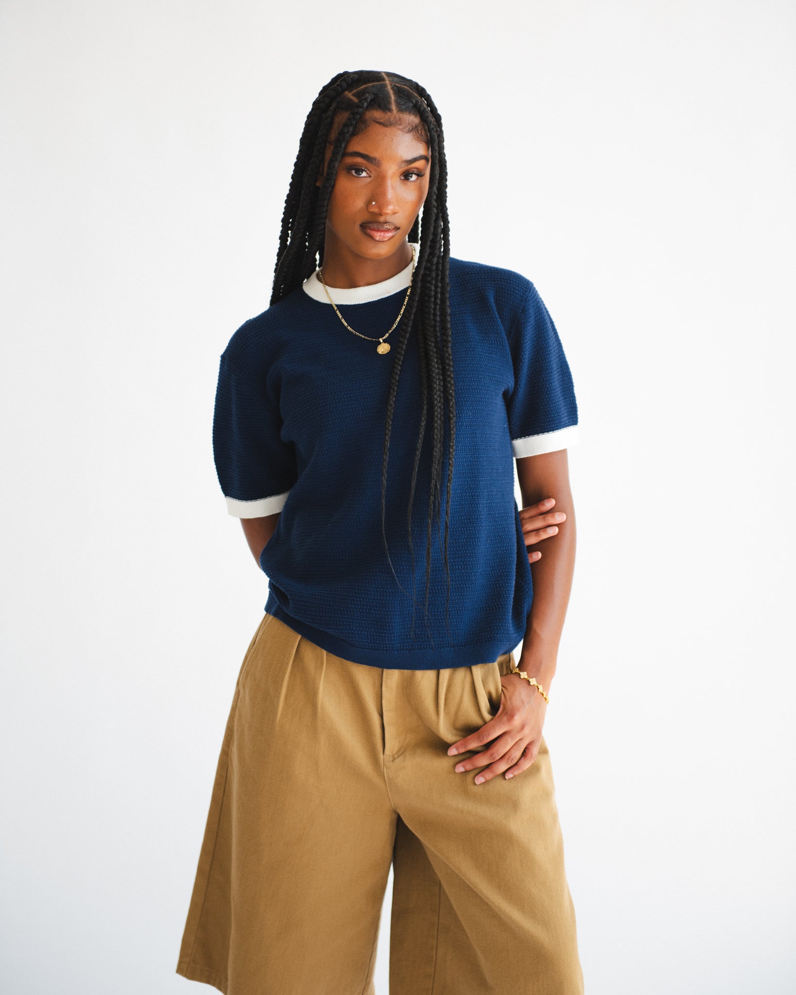 Our Textured Knit Ringer Tee in Navy. Mid-weight 70s inspired ringer tees, elevated with a fully knitted body in a unique textured stitch. Crafted from our signature 100% organic cotton, they feature a classic fit with a semi-cropped length for effortless styling.